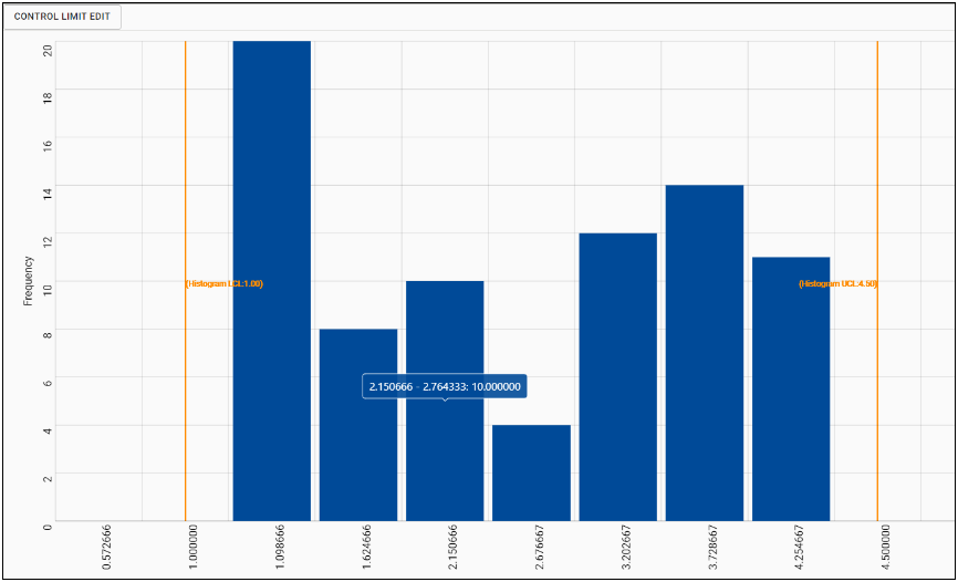 A histogram shows the distribution of the data provided from the samples. A typical histogram has a normal distribution, meaning that most data points will fall in the middle of the graph and fewer will fall towards the outside, forming a bell curve. A distribution that is normal is just the most common pattern. There are other types of curves, such as skewed distribution or double-peaked distribution, which may be typical for certain processes. If a bell-shaped curve is formed on the histogram, then any variations in the data are most likely due to an assignable cause. Assignable causes influence variations, which can occur in materials, environment, machines, peoples, etc. Ultimately, the histogram shows the consistency of a process.Histograms should be used when data is numerical and the shape of the distribution is to be observed. Observing the shape of the graph can help to determine whether or not the data is distributed normally, if a change has occurred in the process over time, or if two or more processes are different. This graph can also help to communicate with others about the data distribution or determine if a process will be able to meet the requirements of a customer.