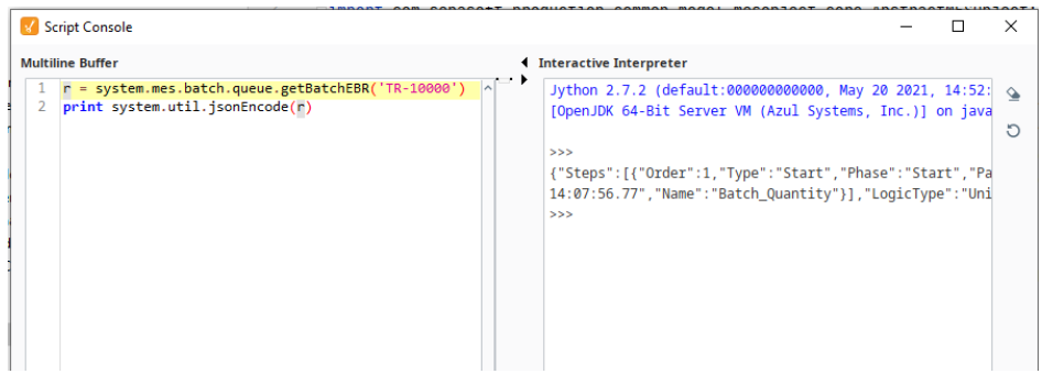 For Batch EBR: Use the EBR Viewer component or the system.mes.batch.queue.getBatchEBR(batchID, includeIdleSteps, includeSystemParameters, timeoutSeconds) scripting function.