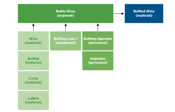 If more detail is desired for lot trace-ability and/or production control, then more input resources can be added to the Bottle Wine segment. Bottles, Corks and Labels, all of which are material, have been added to the segment. Also, an Inspector has been added as personnel. There is no limit to the number of input resources that can be added to a segment.