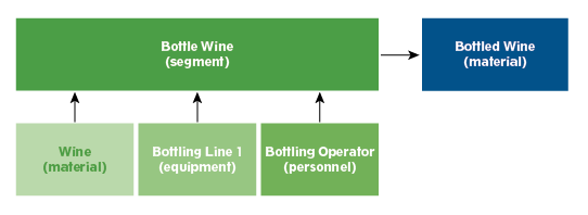 ISA-95 provides the concept of segments to define any task that is done during manufacturing. Tasks all require input resources in terms of material , equipment and personnel . The image shows a basic task (segment) for Bottling Wine that has three input resources, Wine, Bottling Line 1 and a Bottling Operator, and one output product Bottled Wine.