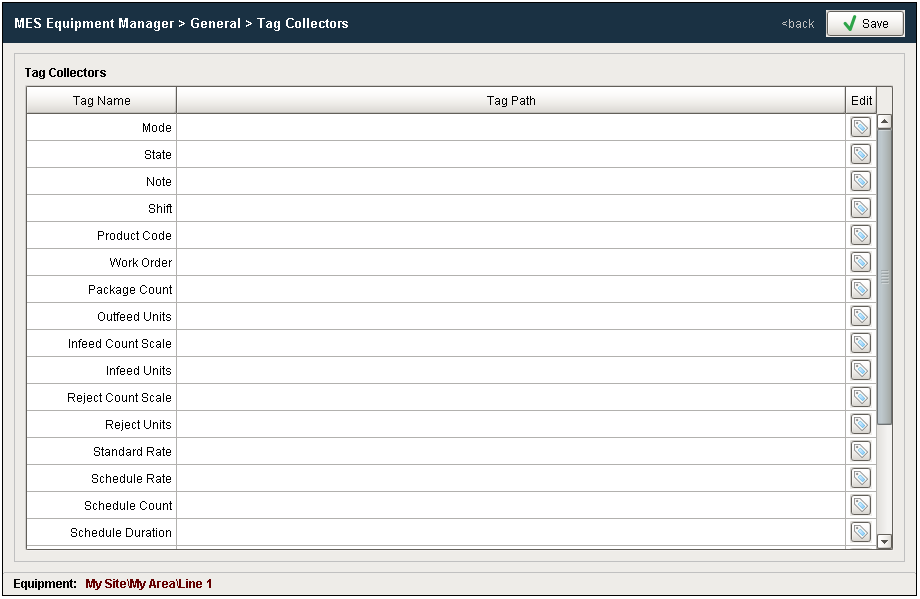 Tag Collectors are provided to allow any of the parameters needed to drive OEE Metrics to be provided externally to the OEE module. Virtually all the Tag Collectors can be left blank in which case the OEE engine will determine the value from product code configuration information as defined in the OEE Material Manager or from internal calculations. Exceptions to this would be the equipment state and counts where needed.