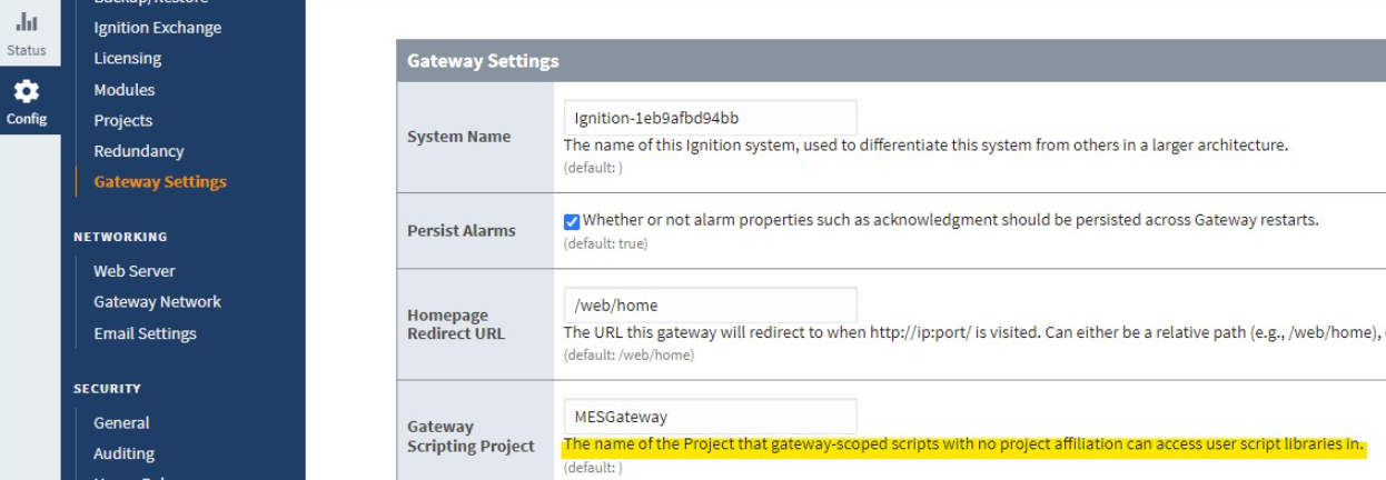 • In the Ignition Gateway > Config > Gateway Settings, enter the Designer Project file name to Gateway Scripting Project. Doing this ensure that the control limit script is accessible as a Gateway-Scoped Script.