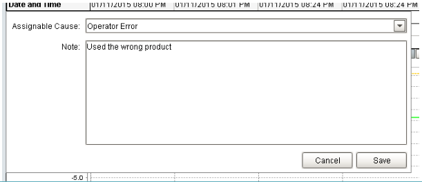 If you pull up the control chart, you will see an indication of the out of control sample. You have the ability to right click on the point and assign a cause and enter in a note.