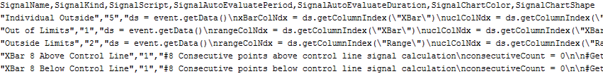To export signal entries, right-click anywhere on the table containing signal entries and select the Export menu item. A dialog box will appear to allow for the selection of an existing file or the entry of a name for the new file to which the out of control signal entries are saved. If a file extension is not entered, then the default .csv will be used. The first line of the file must at least contain the property names separated by commas. If additional names exist, they will be ignored. The property names can be in any order. Below is a sample csv file showing multiple signal entries. The lines in the example shown below have been shortened.