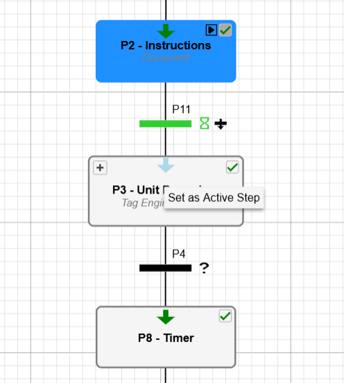 | Set as Active Step | A green arrow icon allows you to set a step as the active step in the recipe. Clicking this icon on a step designates it as the new active step. Only one step within an execution path can be selected at a time. This allows you to repeat previous steps or skip ahead to future ones. If a step is not eligible to be changed to as an active step, based on where the recipe is currently executing in the logic engine, the Change Step Icon will be hidden. ![]() |