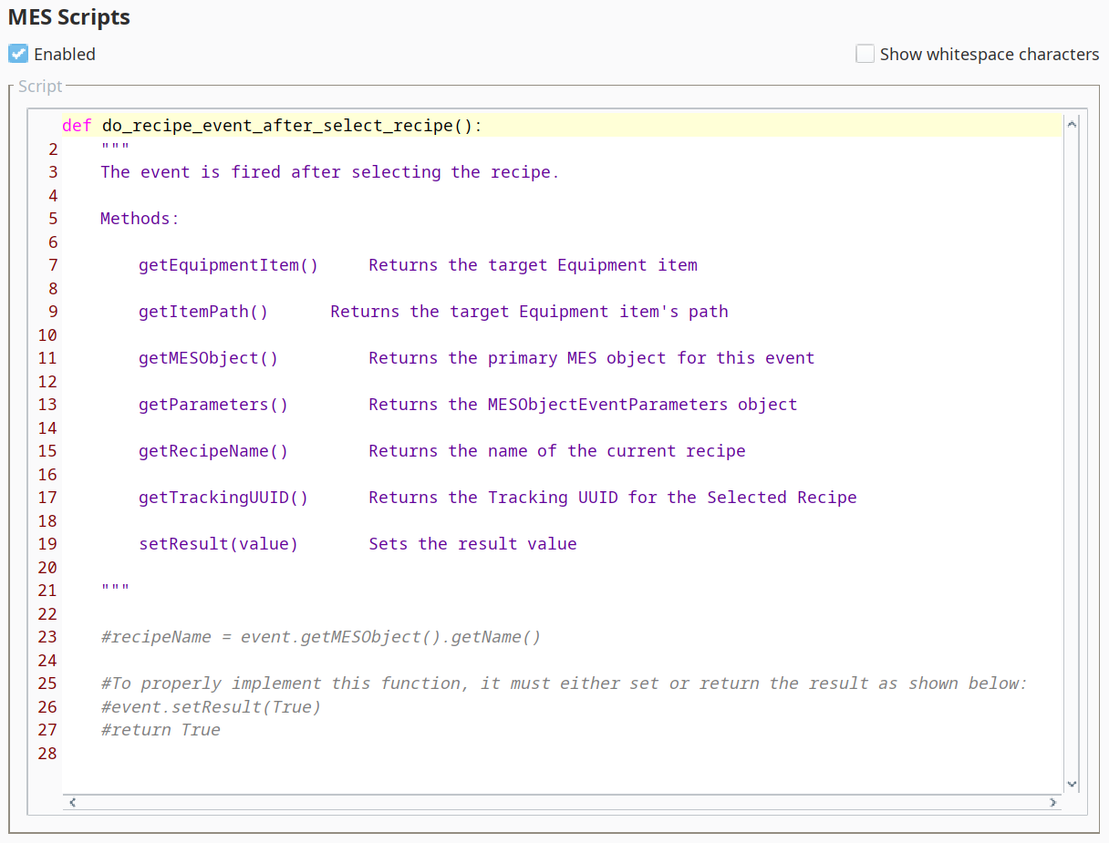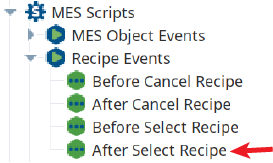 Each Equipment item that has just activated a Recipe will execute this event script after the selection event is recorded. The script will be initially unimplemented, and can be updated via the After Select Recipe MES Script under Recipe Events in the MES Scripts area of the Project Browser.