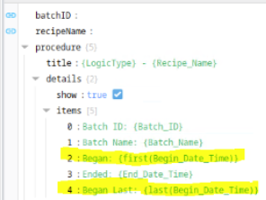 Any batch procedure-level parameter and data items in the EBR can be referenced and displayed as value in the title property. To view all the data items in an EBR, see sample script queue.getBatchEBR and Print to JSON. |