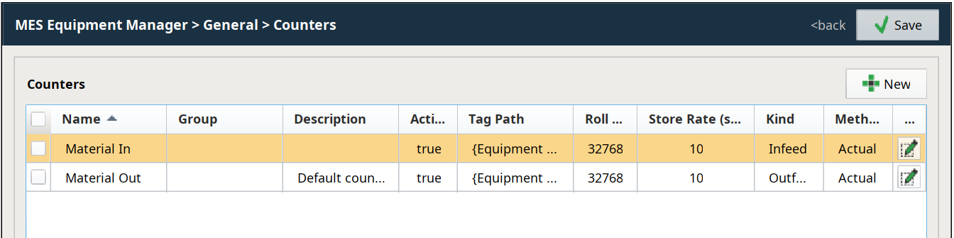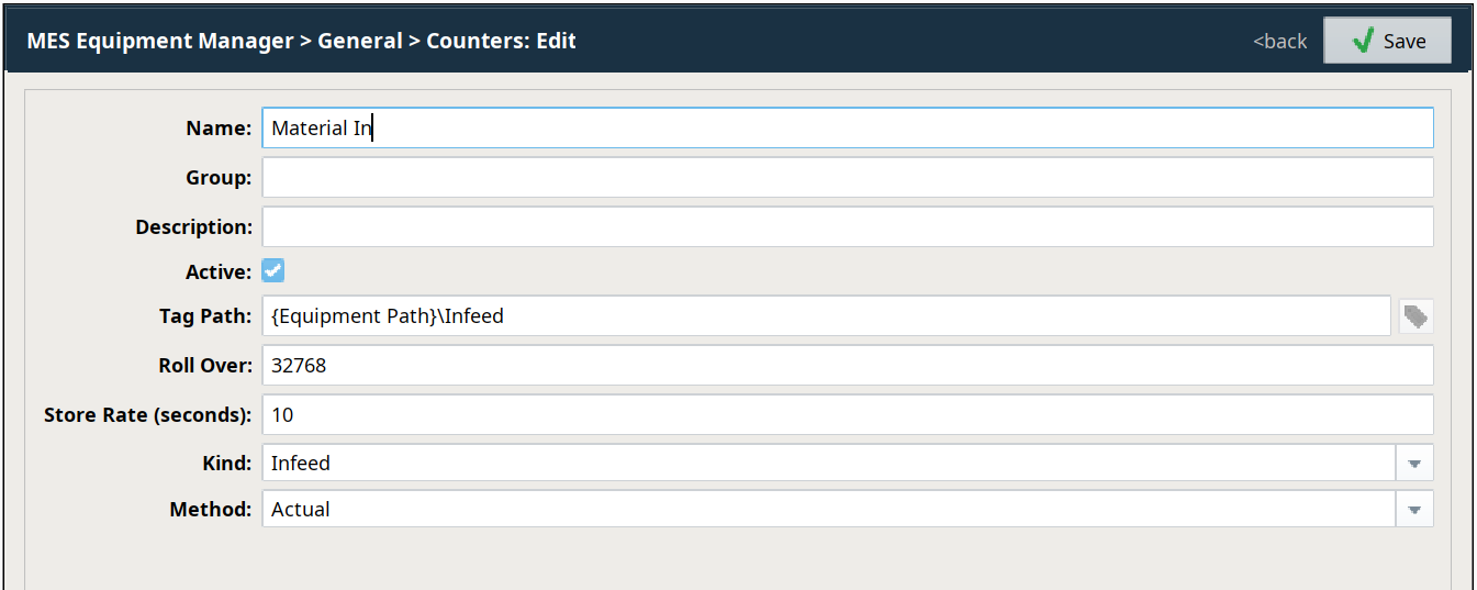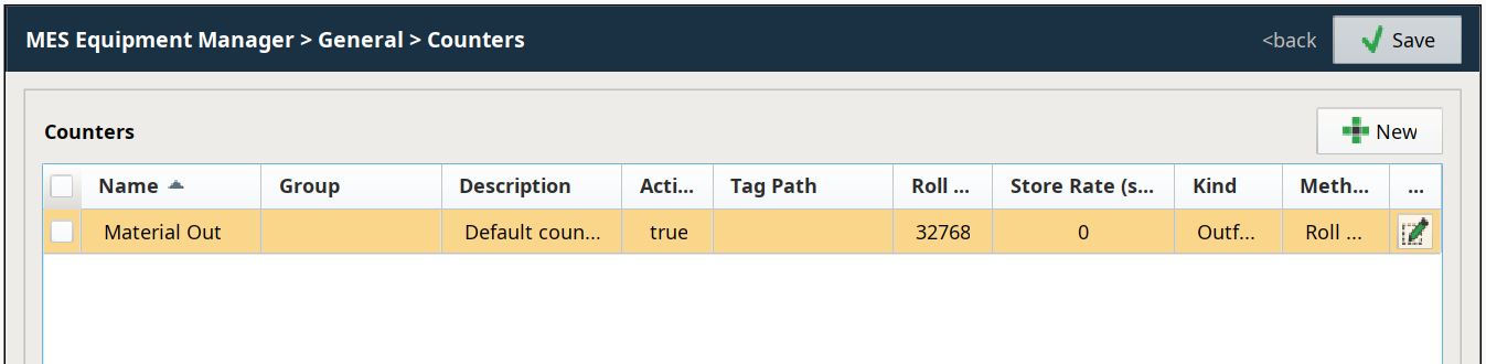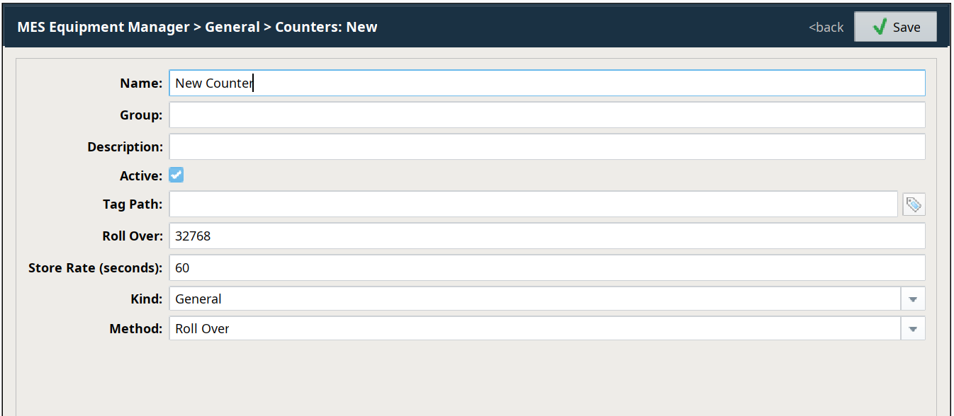 To create a new MES Counter, click and complete the fields. Click to save the new MES Counter. For details on configuring MES Counter properties, refer to MES Counters.