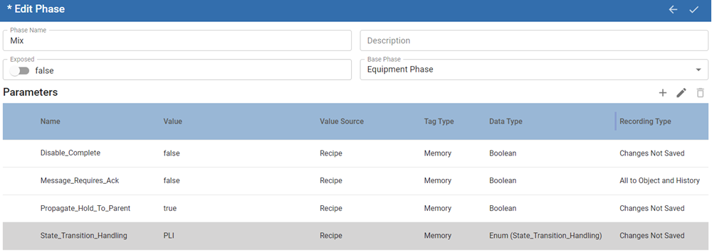 | State_Transition_Handling | PLI/Auto Defaults to PLI. | Recipe | Memory | Enum (State_Transition_Handling) | Changes Not Saved | Sets the handling of the equipment phase. PLI - expects a notification coming from a PLI. Auto - does not expect a notification from a PLI. Other sources within the application layer can notify handling. |