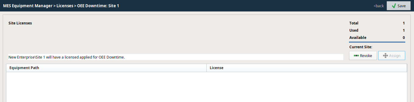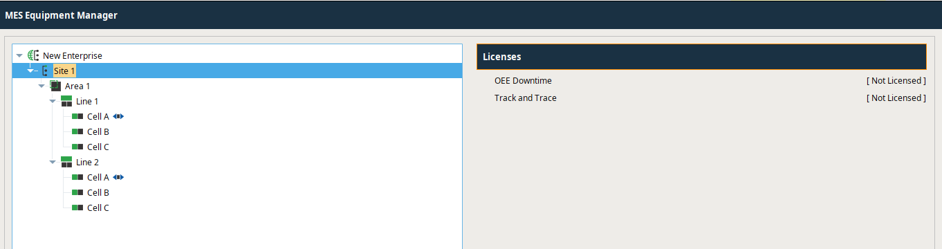 - Click on the Site level in the MES Equipment Manager component and then click on the desired Sepasoft module in the Licenses section.