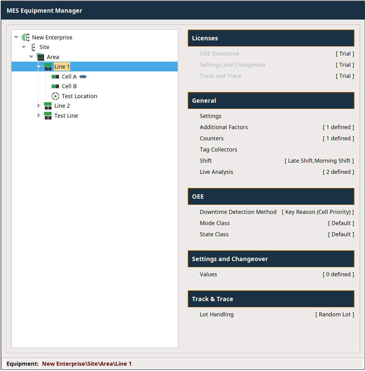 From the main view, equipment may be created, modified, or deleted. As the selection within the equipment tree changes, the available menu categories and options on the right will also change. Some options are dependent upon which module(s) are installed and will only be shown when the corresponding module is available.