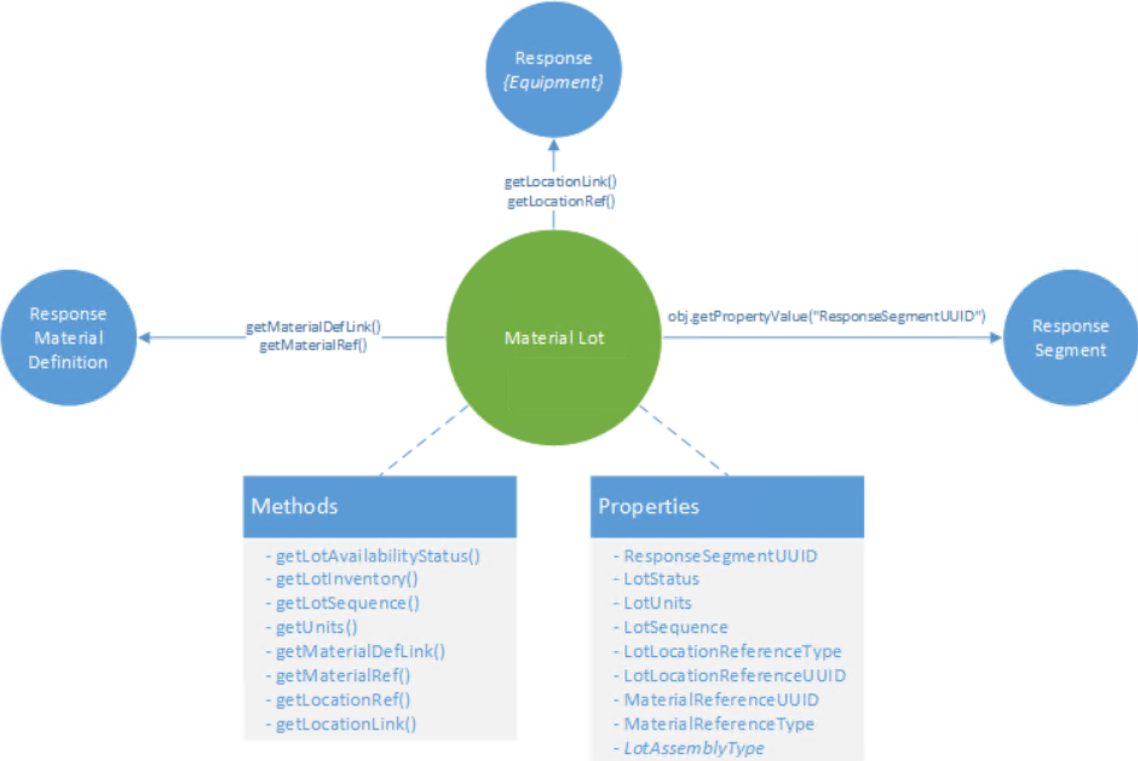 The Material Lot object stores references and links to other objects associated with it. Object functions are provided that allow you to access the Response Segment that created the Material Lot, the Response Material Definition for the Material Lot and the Response Equipment (i.e. Response Storage Unit), where the Material Lot is located.