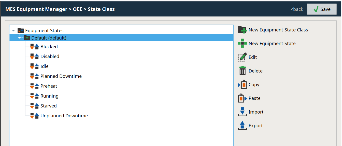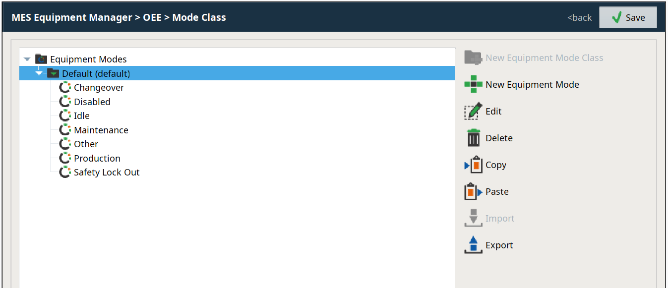 Both the Mode Class view (available Equipment Mode Classes and Equipment Modes) and the State Class view (available Equipment State Classes and Equipment States) allow creating, editing, copying, pasting importing and exporting and deleting their respective entries.