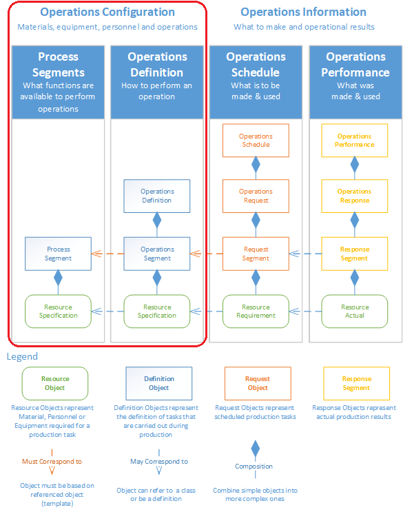 Operations Configuration Objects as defined by ISA-95 represent the definition of tasks that may be carried out during production. There are three object types that fall under this category, Process Segment, Operations Segment and Operations Definition. Each of these objects inherits the AbstractMESObject properties and methods.