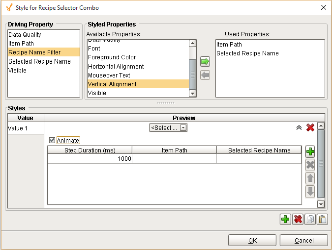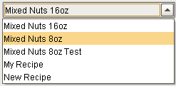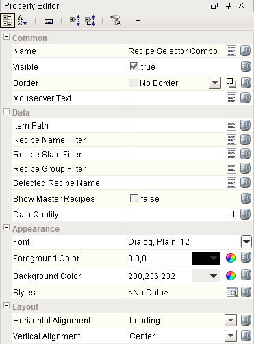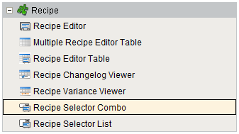 A component that is added to Ignition windows to select recipes in a drop down list. This is just one method of selecting a recipe for a production line, cell, cell group or location. For more information on the other methods see the Selecting and Downloading Recipes section. The Recipe Selector Combo component is automatically updated when recipes are added, removed, etc.