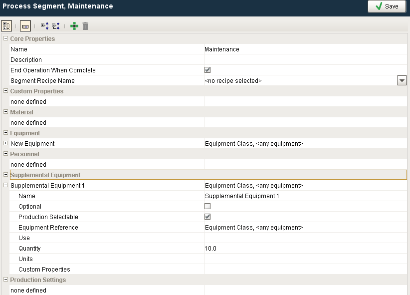 | Production Selectable | Boolean | ProductionSelectable | This box is checked by default. If this setting is unchecked then this property selection will not be visible to the operator in the MES Material Selector component. |