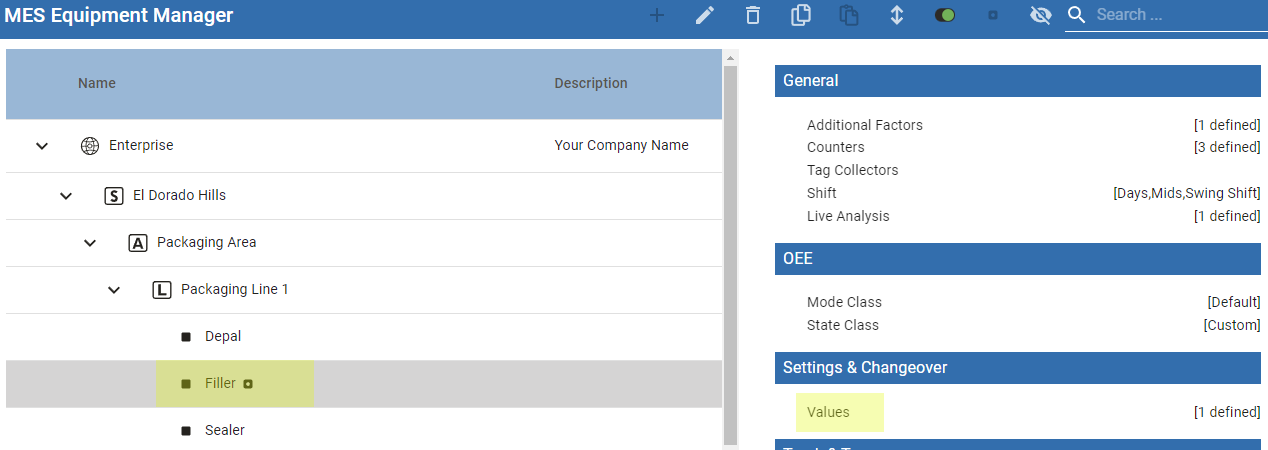 - In Equipment Manager, select one of the cells that represent the Filler or Sealer and under Settings & Changeover, select Values.