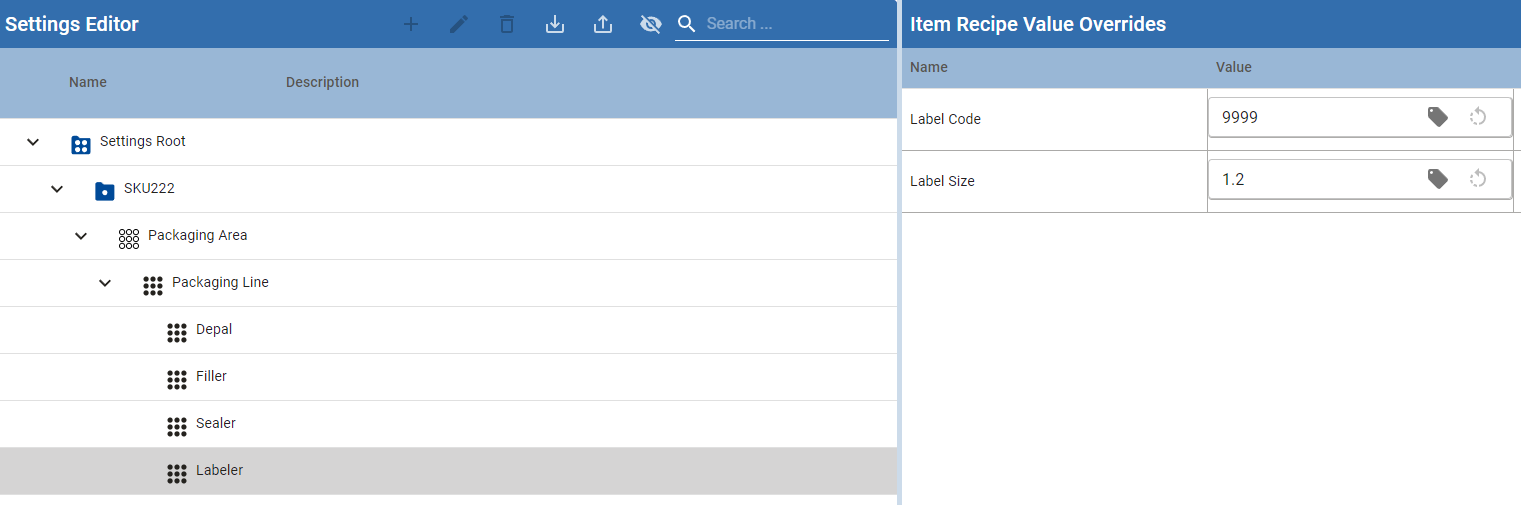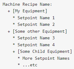 Add settings as Machine Recipes. This view enables master/descendent inheritance of settings. You can control the enabled functionality in the properties, such as editing setpoint values.
