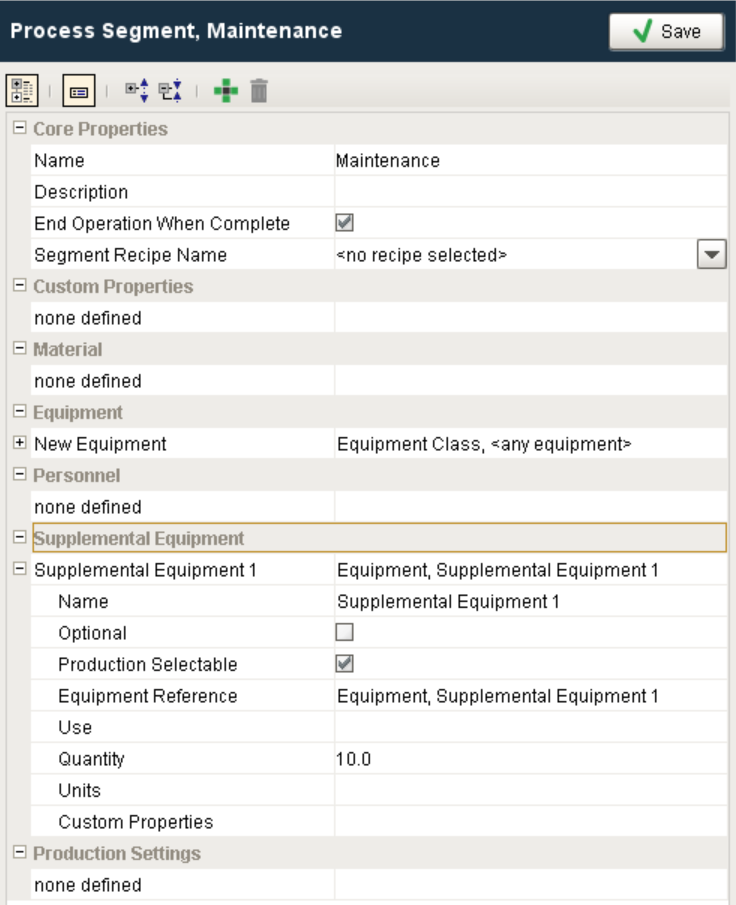 This object has the information about supplemental equipment (any equipment that is not part of the production model but could be used in the process) that may be a part of the operation and is stored as a complex property object of a process segment.